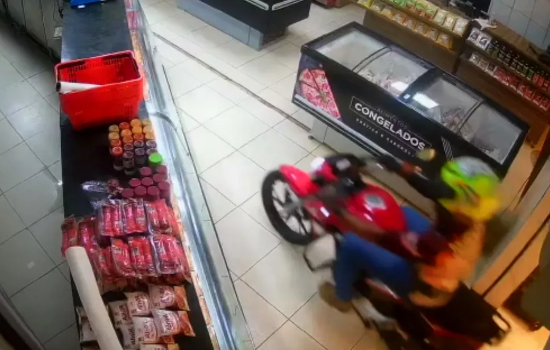 O crime aconteceu em um comércio na Avenida Rio Verde, na Vila Rosa, na noite de segunda-feira (25). Nas imagens é possível ver um homem, de capacete verde e camisa preta, entrando com uma moto vermelha dentro de um açougue.