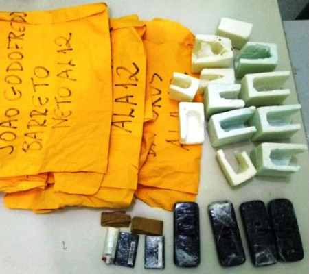 Foram revistados quatro envelopes, que continham barras de sabão caseiro com quatro celulares, duas baterias de celular, sete porções de maconha pesando um pouco mais de 63 gramas, além de papel seda e um isqueiro.