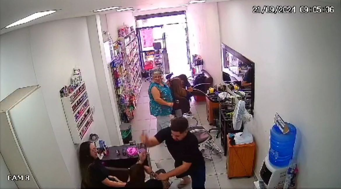 Imagens gravadas por testemunhas mostram o momento em que o indivíduo entra no salão e desfere diversos golpes contra a mulher. Em seguida, ele foge em um veículo de cor preta.
