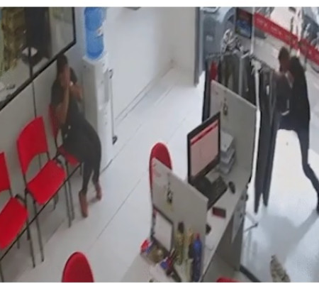 No vídeo, o assaltante coloca a mão na cintura e logo percebe um cliente armado, que reagiu. Logo depois, o cliente começa a realizar disparos e os tiros passam ao lado da mulher. Parte da loja é destruída, mas ela não é atingida.