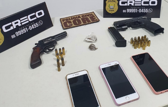Durante o cumprimento do mandado pelas equipes, foi efetuado a apreensão de duas armas de fogo. Foram apreendidos um revólver calibre 38 e uma pistola .40 da Polícia Militar do Piauí com mira laser, munições dos mencionados calibres e porções de maconha.