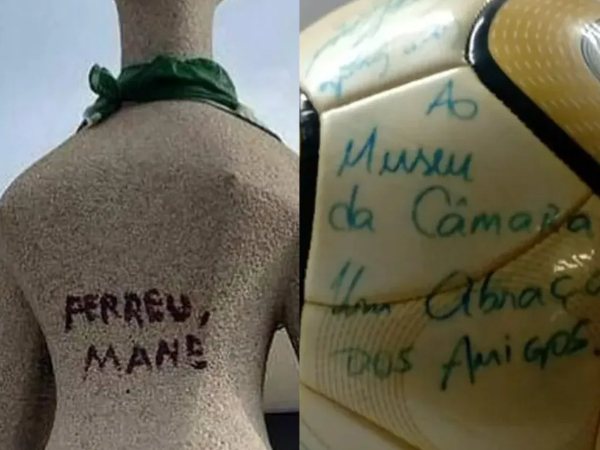 Mulher que pichou 'perdeu, mané' em estátua do STF e homem que roubou bola autografada por Neymar são alvos da PF — Foto: Montagem