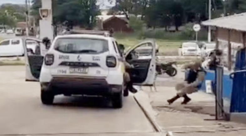 Em seguida, o motociclista conseguiu se desvencilhar e fugir a pé. Uma viatura da PM entrou no pátio do posto e atingiu o homem, que continuou correndo mesmo após o impacto.