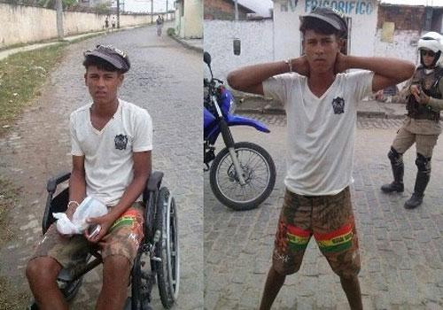 O indivíduo ficou em pé e começou a andar. Com o ?cadeirante? foram encontradas alguns papelotes de drogas.