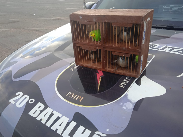 A prisão ocorreu após o carro modelo “HB20”, veículo que o suspeito estava, passar por uma abordagem policial. A guarnição, ao realizar uma vistoria na área interna do veículo, constatou a presença de uma gaiola contendo quatro pássaros, sendo três trinca-ferros e um periquito-australiano.