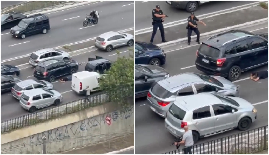 Imagens gravadas no local mostram um policial civil armado com uma submetralhadora perseguindo um dos fugitivos no meio do trânsito. O agente atira contra o suspeito, que cai e é detido. Outro suspeito, ao ver o comparsa ferido, se joga no asfalto e se rende.