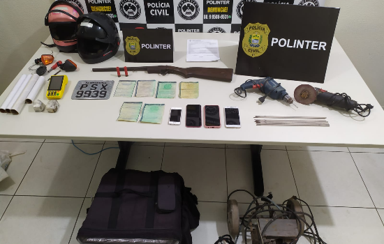 Na oportunidade foram presas cinco pessoas. Nas residências foram encontrados materiais de adulteração de veículo, como máquina de solda, furadeira, lixadeira, além de placas falsificadas de motos. Também foi apreendida uma arma de fogo espingarda, bem como entorpecentes do tipo maconha e um veículo Citroen.