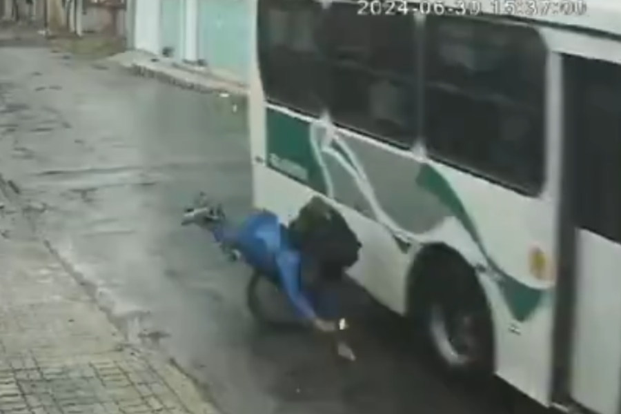 Imagens de uma câmera de segurança registraram um incidente em Nova Iguaçu, na Baixada Fluminense, em que um ônibus quase atropelou um entregador de aplicativo. Lucas Alexandre, de 18 anos, aparece pedalando devagar e olhando para o celular, provavelmente conferindo o endereço de uma entrega, quando um ônibus da linha 562 (Três Fontes - Pavuna) esbarra em sua bicicleta.