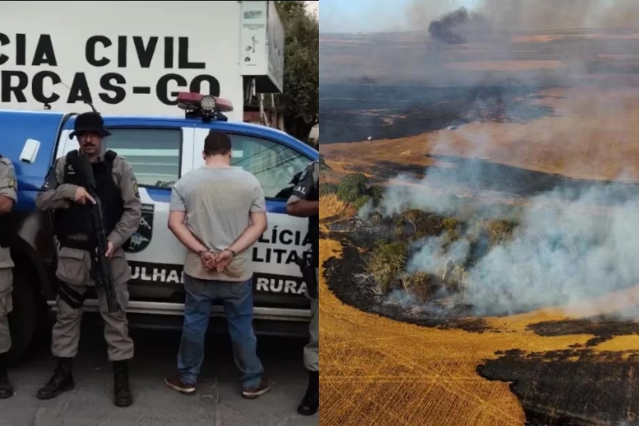 Montagem mostra a prisão do acusado de incendiar fazendas propositalmente mediante pagamento de R$ 300,00 em cidades goianas e ao lado a imagem das queimadas devastadoras | FOTO: Reprodução