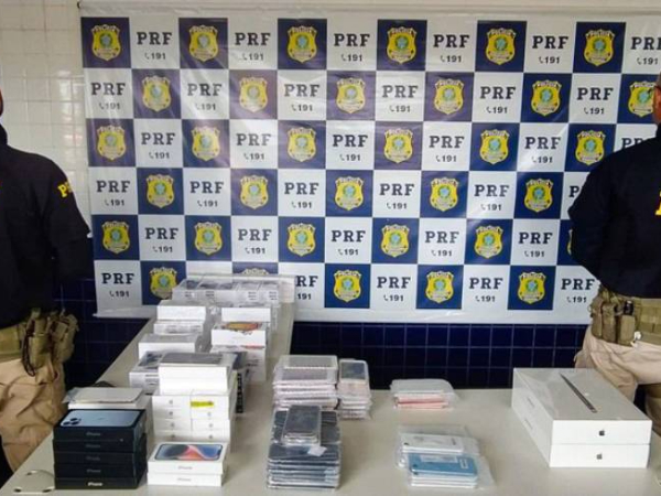 Os policiais estavam realizando fiscalização de rotina quando abordaram um ônibus que vinha de São Paulo com destino ao Ceará. Durante vistoria no compartimento de bagagens, os policiais encontraram 137 smatphones, sendo 100 iphones, 35 redmi e dois poco x4, além de dois macbooks e 30 adaptadores de celular.