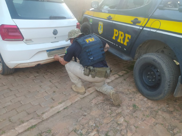 A PRF realizava ronda quando avistou o veículo transitando sem a placa dianteira. Diante disso, foi dada ordem de parada. O carro era conduzido por um homem de 34 anos e tinha como passageiro um homem de 47 anos.