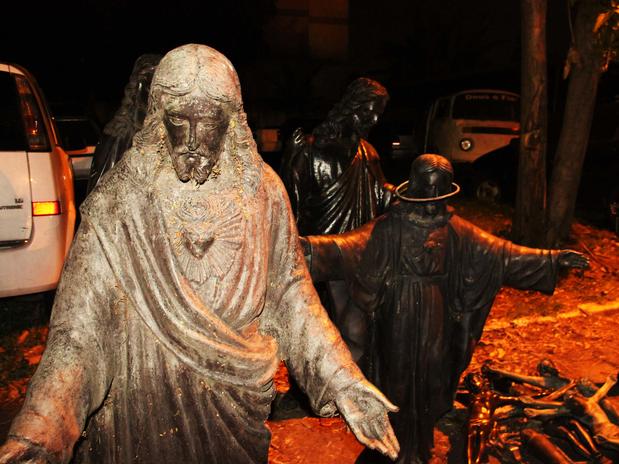 O incidente aconteceu por volta de 1h. Quatro homens foram flagrados carregando um veículo com as peças roubadas. Dois dos suspeitos tentaram fugir, mas também foram detidos. Logo depois, uma mulher envolvida com a quadrilha foi encontrada ? ela estava em um carro de apoio aos criminosos. Dentro da Kombi usada pela quadrilha havia nove estátuas, nove crucifixos, vasos e outros objetos de metal. Os cinco e todo o material roubado foram encaminhados para o 91º DP - Ceagesp.