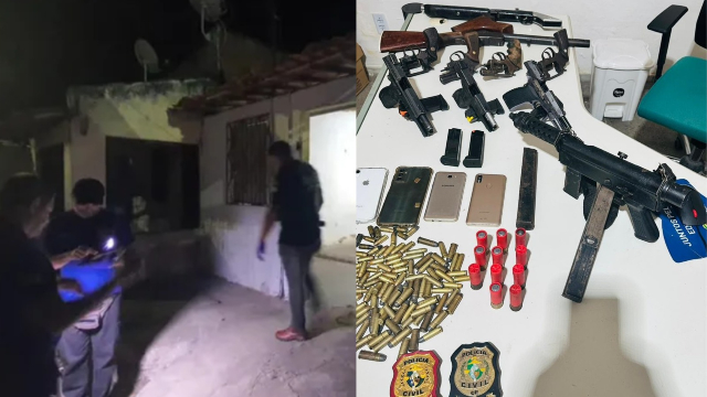 Com as buscas no interior da residência, foram apreendidas: uma metralhadora, um rifle, três espingardas, quatro pistolas e quatro revólveres. Após a abordagem no local, os três suspeitos, o adolescente e todo o material ilícito apreendido foram conduzidos para a Delegacia Metropolitana de Maranguape, onde foram realizados os procedimentos cabíveis.
