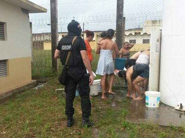 No entanto, imagens registradas por volta de 9h30 deste sábado (19), na área externa da Penitenciária Feminina, que fica dentro do complexo, mostram um grupo de detentas enchendo baldes com água.