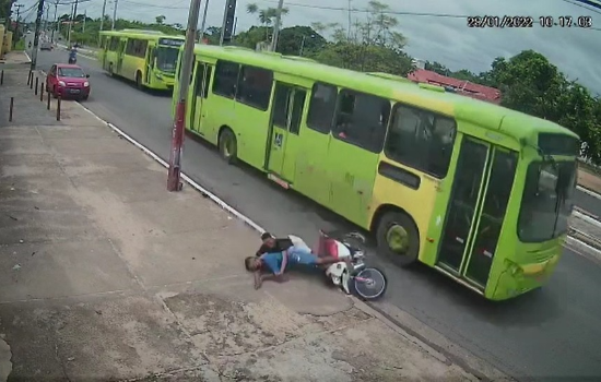 Um vídeo divulgado nas redes sociais mostra o momento em que um ônibus derruba dois suspeitos de assalto de uma motocicleta em movimento no bairro Angelim, na zona Sul de Teresina.
