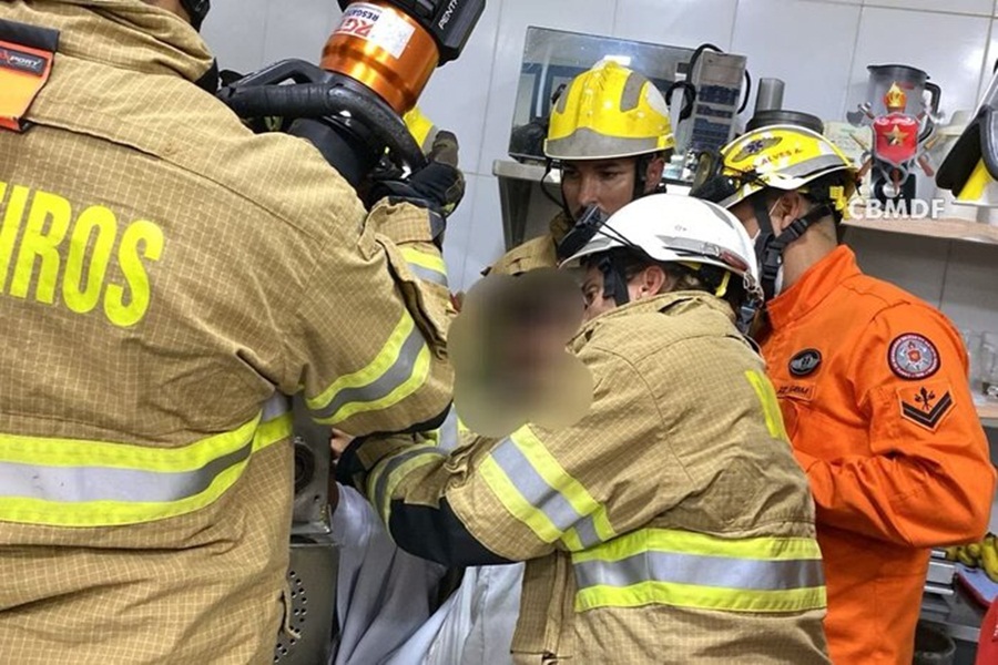 Segundo o CBMDF, a mão direita da vítima ficou presa no equipamento. Durante o resgate, a equipe manteve o jovem calmo.