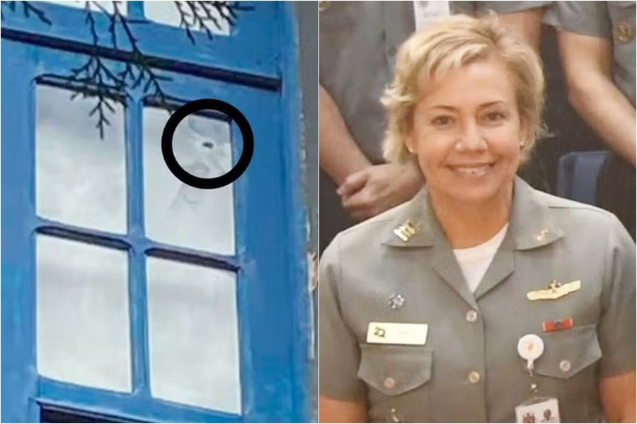Uma foto da TV Globo mostra a janela da Escola de Saúde da Marinha, no Hospital Naval Marcílio Dias, com a marca do tiro que matou a médica Gisele Mendes de Souza e Mello, de 55 anos, nesta terça-feira (10). Ela foi atingida por uma bala perdida enquanto participava de um evento no auditório.