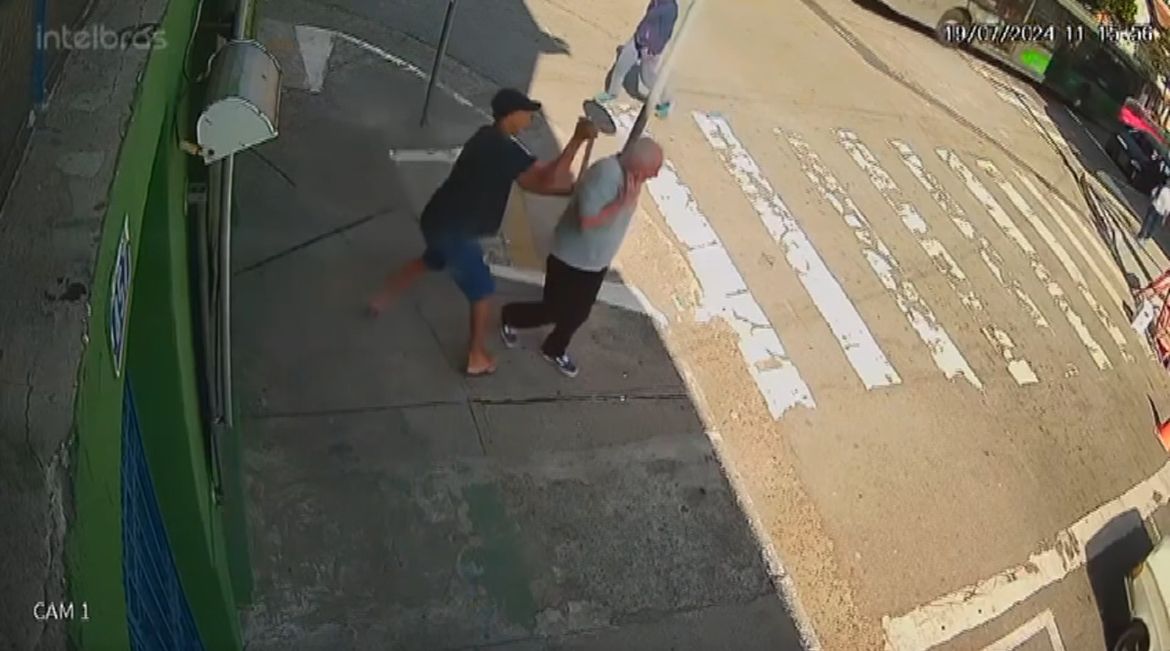 As imagens capturadas por uma câmera de segurança mostram o idoso caminhando na rua com o celular ao ouvido, quando o adolescente rapidamente toma o aparelho e começa a fugir.