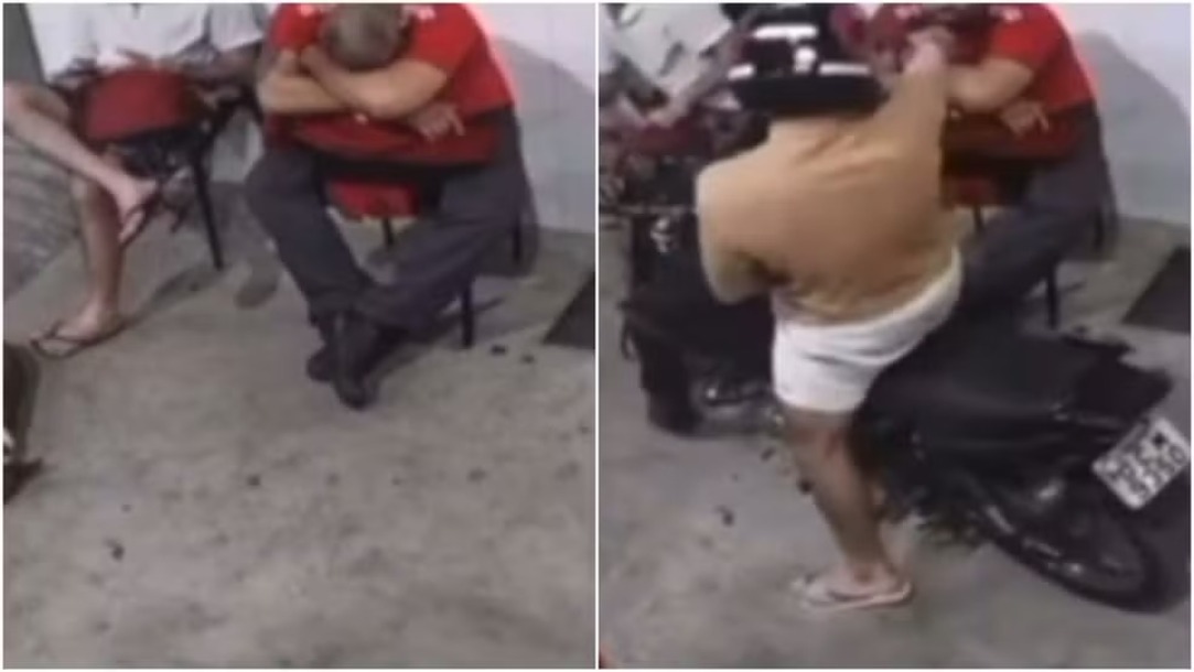 A cena foi filmada por câmeras de segurança. O homem que seria alvo do criminoso estava debruçado sobre uma cadeira, com o cabeça entre os braços. O criminoso chegou de moto e capacete já tentando atirar.