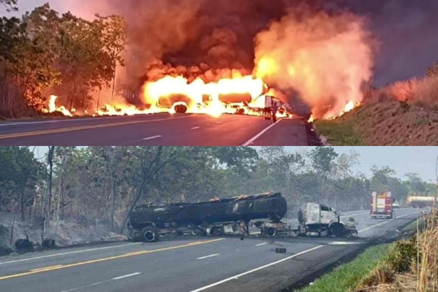 Segundo a concessionária que administra a via, a Eco 135, o caminhão transportava 20 mil litros de gasolina, 5 mil litros de diesel S10 e 5 mil litros de diesel comum. Imagens que circulam nas redes sociais mostram o veículo em chamas atravessado na rodovia, fechando os dois sentidos da via.