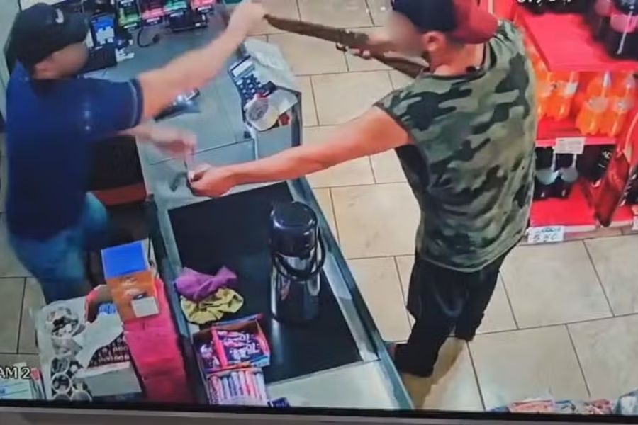 Nas imagens, o assaltante aparece entrando no estabelecimento armado com uma espingarda. Ele se aproxima do balcão e anuncia o assalto, forçando o comerciante a abrir o caixa e entregar uma quantia em dinheiro. No entanto, quando o criminoso se aproxima, a vítima reage com rapidez, toma a arma de suas mãos e o coloca em fuga.