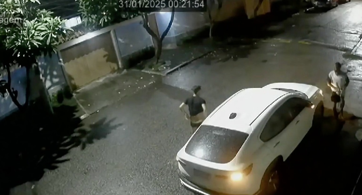 Câmeras de monitoramento registraram o crime, na madrugada de sexta-feira (31). O ex-atleta estava no carro branco parado, quando foi surpreendido pelos assaltantes, que chegam de carro.