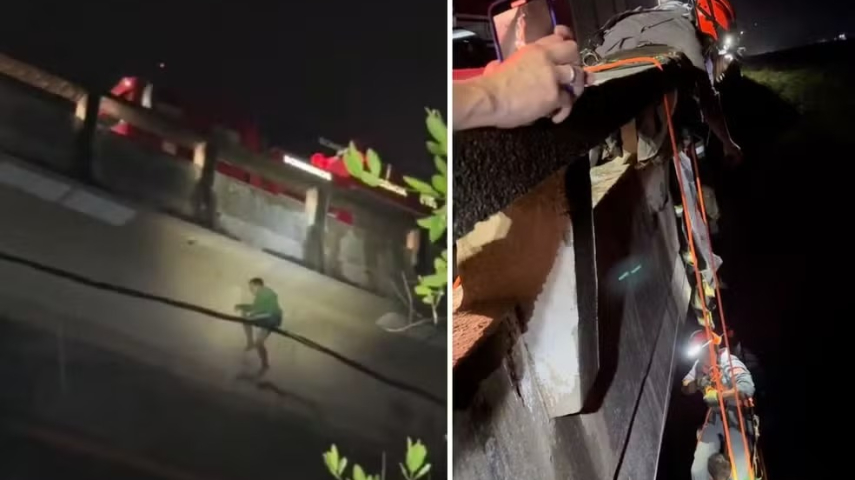 Um indivíduo de 28 anos foi resgatado depois de ser arremessado de uma ponte e ficar suspenso por cabos de aço em Bertioga, no litoral de São Paulo. Um vídeo mostra a vítima aguardando o resgate, enquanto luta para não cair. Segundo informações, o homem afirmou à polícia ter sido sequestrado dias antes, e um suspeito foi detido pelo crime.