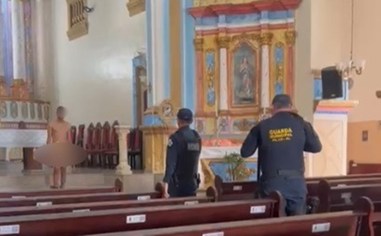 O vídeo de um homem nu invadindo uma igreja católica na cidade de Pilar, no interior de Alagoas, viralizou nas redes sociais nesta terça-feira (17). O jovem, que aparece nas imagens com apenas uma corda amarrada à cintura, e carregava dois crucifixos.