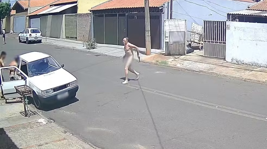 O que aconteceu: imagens de câmeras de segurança mostram parte do crime. No vídeo é possível ver durante uma discussão entre o filho da vítima, um adolescente, e o suspeito, vestido apenas com uma toalha, na rua. A situação se agrava quando os dois entram na casa. Momentos depois, duas pessoas saem da residência, e é possível ver Thiago Alves ferido enquanto o padrasto, nu e armado com facas, persegue pai e filho.