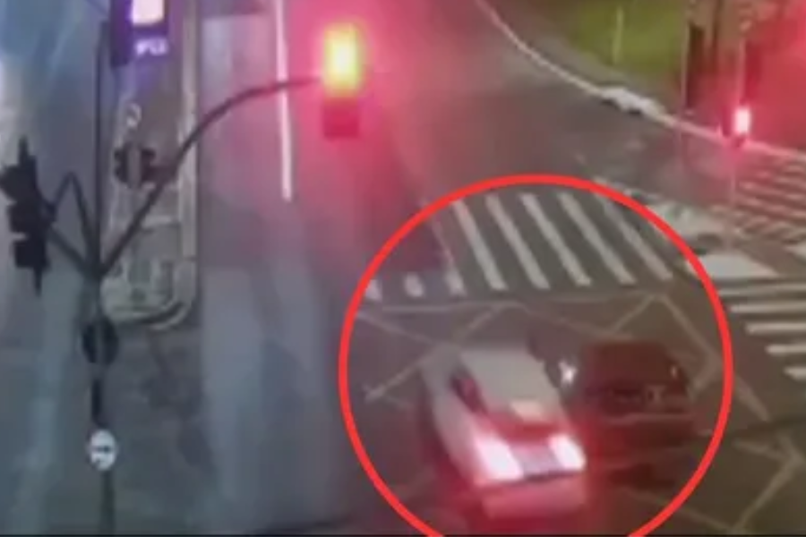 O acidente foi registrado pelas câmeras de segurança. As imagens mostram quando o Jaguar branco passou no semáforo vermelho e atingiu o Kwid laranja, que cruzava a avenida. (Veja o vídeo abaixo).