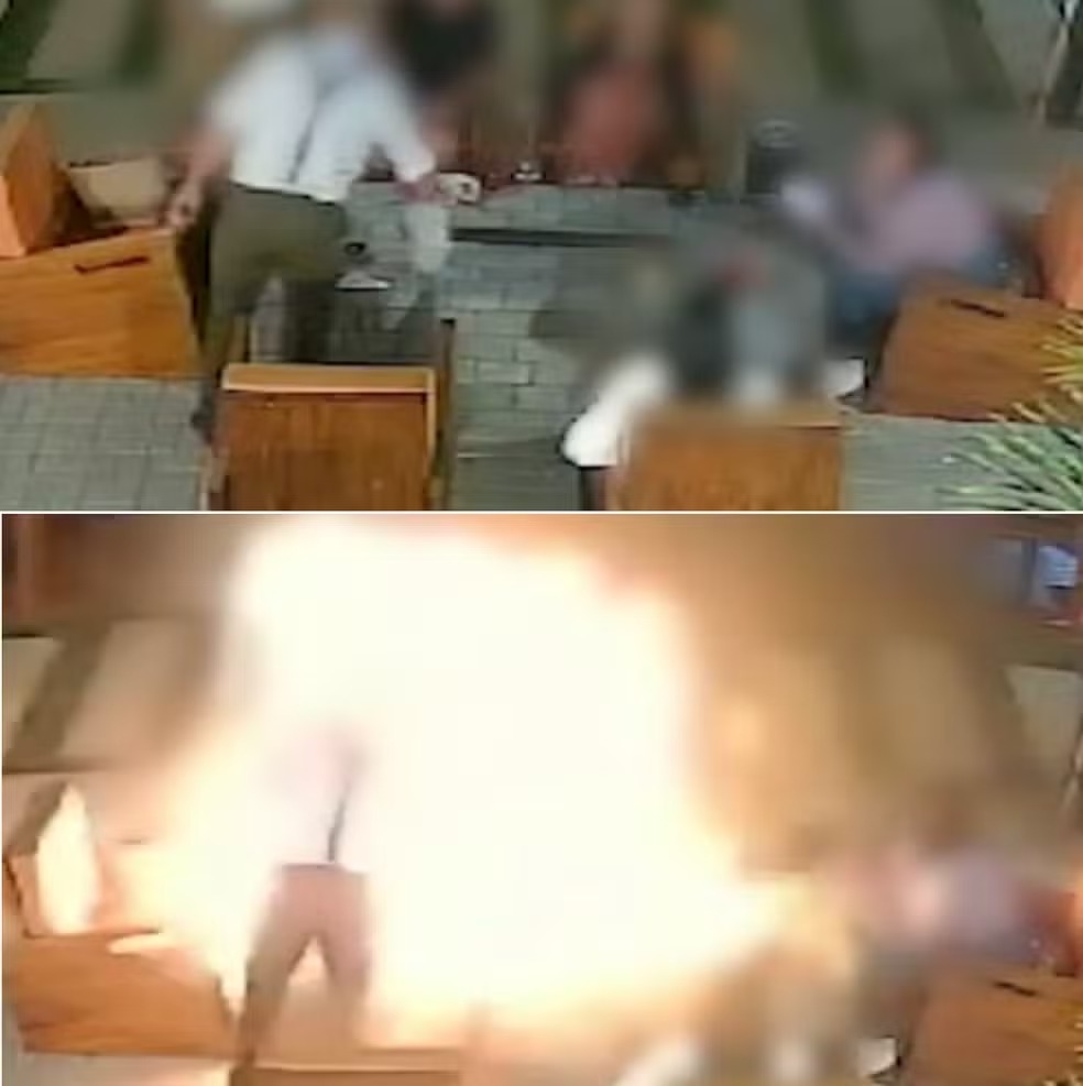 O QUE AS IMAGENS MOSTRAM - O vídeo da câmera de segurança mostra que os cinco clientes estavam em volta da mesa, próximo a entrada do restaurante no ambiente externo. Antes da explosão, o garçom chegou a colocar uma vasilha em cima da mesa. Em seguida, ele pegou a garrafa de álcool e derramou na lareira, provocando a explosão e o início das chamas.