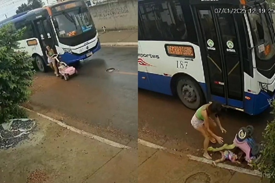 Um grande susto! Uma jovem de 27 empurrava um carrinho com a filha, de 2 anos, quando tentou desviar de um buraco e foi atingida por um ônibus coletivo, em Várzea Grande, região metropolitana de Cuiabá. Apesar do susto, as duas saíram sem ferimentos. Veja o vídeo abaixo: