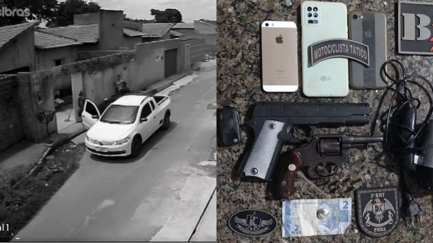 Nas imagens é possível ver que duas mulheres e uma criança estão na porta de casa quando os suspeitos, armados, chegaram em uma Saveiro branca. Quatro pessoas descem do carro e forçam as vítimas a entrarem dentro da casa. Momentos depois, um homem de blusa branca aparece colocando cadeiras no veículo.