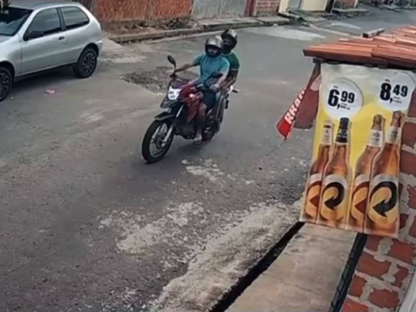 Nas imagens, os dois suspeitos aparecem numa motocicleta vermelha passando por uma rua. Em seguida, eles abordam o estudante, que acaba levando um tiro e cai em seguida no chão, com sua moto.
