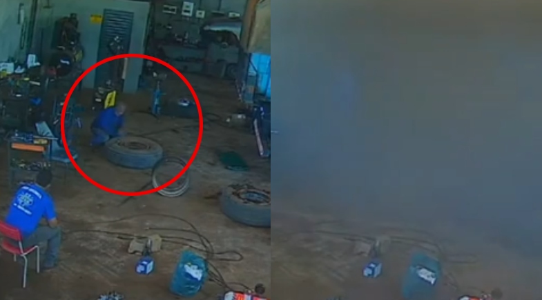 As imagens mostram quando a explosão acontece, com fragmentos do pneu se espalhando pelo local em meio à fumaça. Em seguida, funcionários da oficina saem correndo para buscar socorro.