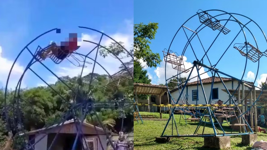 Nas imagens, é possível ver a mulher sentada no balanço com a trava de segurança para trás. Assim que o brinquedo começa a se movimentar, ela bate com força no chão. Um técnico de enfermagem que frequentava o local fez o primeiro atendimento à vítima até a chegada dos bombeiros, que usaram desfibrilador e fizeram manobras de ressuscitação cardiopulmonar.