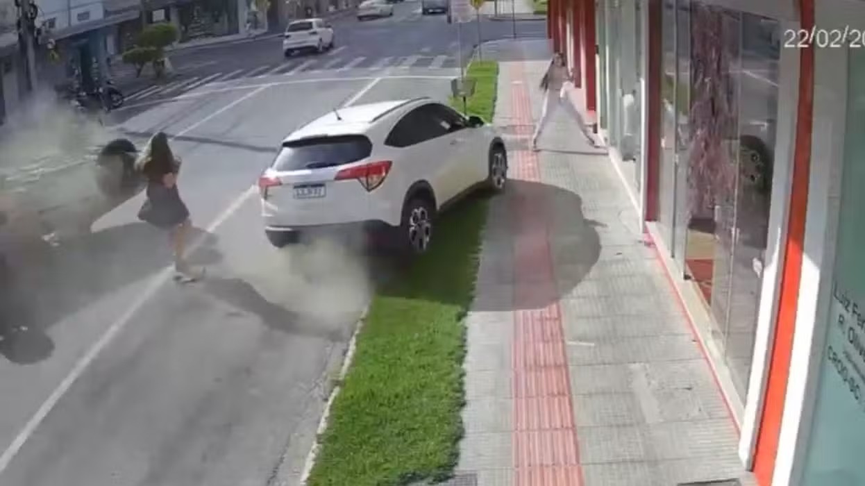 A colisão aconteceu por volta das 9h, na Rua Senador Nereu Ramos, região central do município. No vídeo, a mulher caminha ao lado de um carro estacionado quando, repentinamente, uma Montana atinge um Honda/HR-V parado. Assustada, ela reage rapidamente e corre para a calçada.