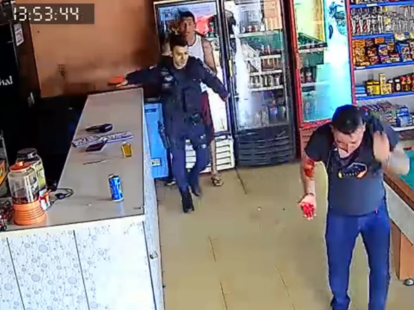 Nas imagens ainda é possível perceber, que o homem estava atrás do balcão, quando começaram as agressões. Logo em seguida é usado o spray de pimenta contra o dono do bar, que é trazido para a frente do balcão. Já do lado de fora o PM deu um chute no homem, que caiu no chão.