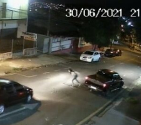 Conforme o registro divulgado pela Polícia Militar, uma caminhonete para na via e chama a vítima que está do outro lado da rua. Ela é atingida por disparos quando chega perto do veículo. Depois disso, o motorista foge.
