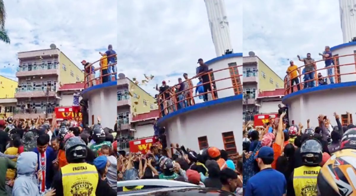 As imagens nas redes sociais mostram moradores reunidos em uma praça de Coari, com tumulto enquanto tentavam pegar o dinheiro lançado por Raione.