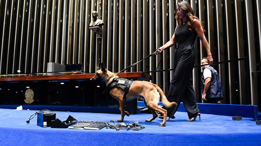 Nesta quinta-feira (25), a senadora Soraya Thronicke, representante do Podemos-MS, introduziu no Senado um projeto de lei (PL 2325/2023) que busca modificar a Lei Maria da Penha (Lei 11.340/2006) com o intuito de assegurar às mulheres o direito de serem acompanhadas por cães protetores em locais de uso coletivo. No evento, a parlamentar apresentou Athos, um pastor-belga-malinois em treinamento para proteger vítimas de violência doméstica.