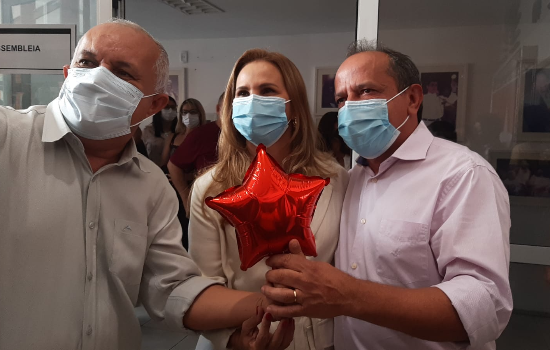 A prefeita de São Raimundo Nonato, Carmelita Castro (PP), prestigiou a filiação do marido deputado estadual Hélio Isaías ao Partido dos Trabalhadores, realizada nesta terça-feira, 22, no Teatro da Assembleia Legislativa.