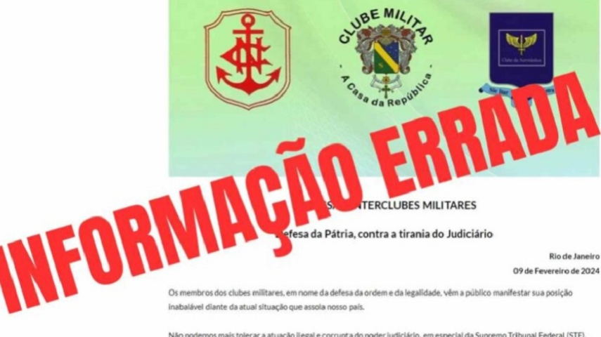 “Está circulando nas mídias sociais uma nota falsa com o título Defesa da Pátria, contra a tirania do Judiciário, datada de 9 de fevereiro de 2024, cuja autoria é atribuída à Comissão Interclubes Militares. Os presidentes do Clube Naval, do Clube Militar e do Clube de Aeronáutica reiteram se tratar de uma fake news!”, destacou.