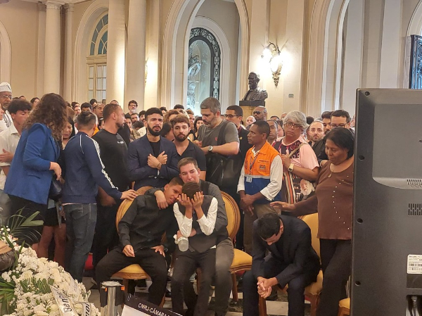 Os filhos, bastante emocionados, e o marido do parlamentar, o jornalista Glenn Greenwald, chegaram pouco depois das 15h ao local e receberam o carinho dos muitos amigos do parlamentar que estavam presentes. A tia que criou David Miranda também esteve no velório.