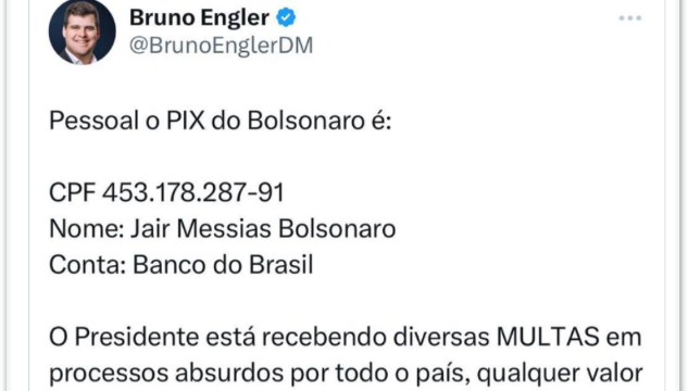 Neste sábado, 24 de junho de 2023, deputados e ex-aliados de Jair Bolsonaro (PL) reagiram aos pedidos de doações via Pix feitos por apoiadores do ex-presidente. Esses indivíduos compartilharam o CPF (Cadastro Nacional de Pessoa Física) de Bolsonaro e solicitaram contribuições financeiras para custear seus processos judiciais.