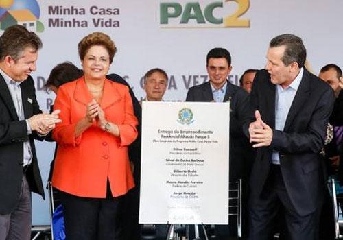 Ao lado do governador de Mato Grosso, Silval Barbosa, do prefeito de Cuiabá, Mauro Mendes, e de vários ministros, Dilma listou obras do governo federal no estado, como duplicação de rodovias federais, construção de sistema para veículo leve sobre trilhos (VLT) e melhoria na infraestrutura de saneamento.