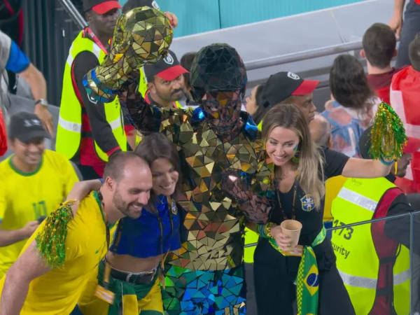 O deputado foi filmado pelas câmeras da transmissão oficial da Fifa no momento em que posava para fotos no intervalo da partida. Ele estava com outras pessoas e a mulher, Heloísa Bolsonaro.