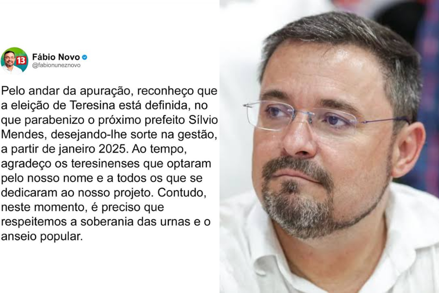 Em seu perfil do Instagram, Fábio Novo reconheceu sua derrota e desejou sorte a nova gestão que terá início em janeiro de 2025. "Parabenizo o próximo prefeito Silvio Mendes, desejando-lhe sorte na gestão. Ao tempo, agradeço os teresinenses que optaram pelo nosso nome e a todos os que se dedicaram ao nosso projeto", escreveu o candidato. A mensagem foi publicada após o avanço da apuração dos votos, indicando a consolidação da vitória de Mendes.