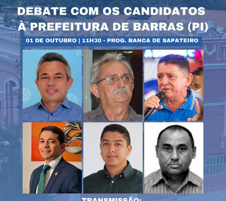 Reiterando o compromisso de pautar a informação com credibilidade e fortalecer a democracia, o Grupo Meio Norte de Comunicação promoverá nesta quinta-feira, dia 01, o debate com os candidatos à Prefeitura de Barras. A transmissão ocorrerá na TV Jornal, afiliada da TV Cultura no Piauí, dentro do programa Banca de Sapateiro, apresentado pelo jornalista Arimatéia Carvalho, a partir das 11h30.