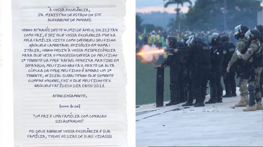 O pai de um dos policiais militares detidos na investigação que apura omissão no evento de 8 de janeiro redigiu uma carta à mão endereçada ao ministro Alexandre de Moraes, solicitando "misericórdia". O texto foi redigido pelo pai do tenente Rafael Pereira Martins, que foi detido junto à cúpula da Polícia Militar do Distrito Federal (PMDF) em agosto de 2023.